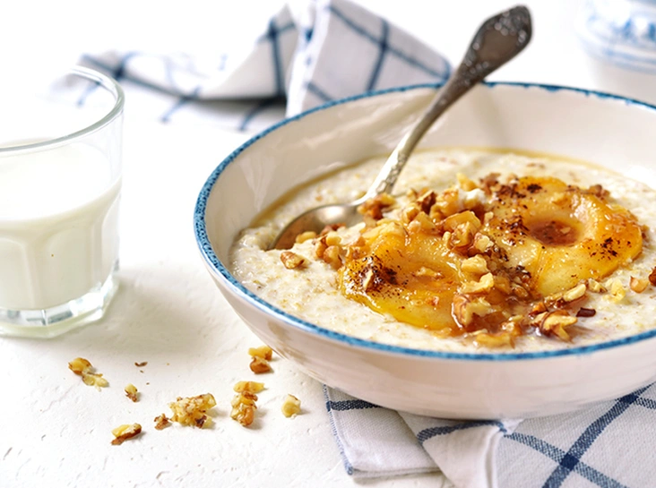 Выложите груши и сахар в большую кастрюлю, залейте водой, доведите до кипения и держите на медленном огне 15 минут. В другой кастрюле сварите овсянку, добавив в молоко стручок ванили (потом его нужно будет вынуть). Разложите кашу по тарелкам, в центр каждой поместите грушу и полейте медом.