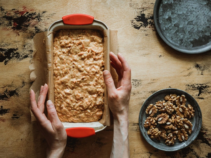 Теперь вылейте тесто в форму для выпечки хлеба. По консистенции оно должно быть рыхлым — это не должно вас смущать. Равномерно распределив тесто по форме, отправьте ее в предварительно разогретую духовку.