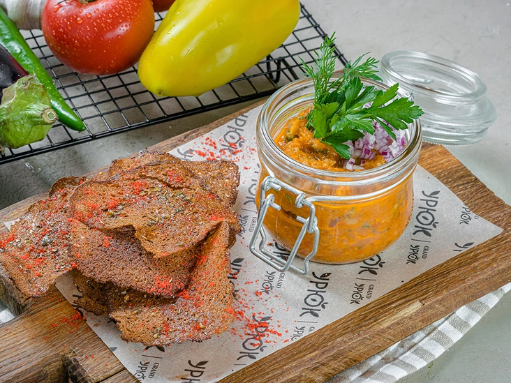 Готовые овощи пропустить через мясорубку. Далее выложить в кастрюлю, довести до кипения, заправить специями. Охладить. Подавать с зеленью, хлебными чипсами/лепешкой.