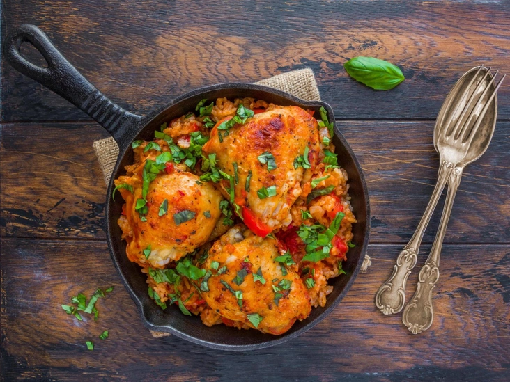 Всыпьте к уже готовящимся ингредиентам рис, обжарьте его, помешивая, не дольше минуты, и верните в сковороду куриную кожицу. Влейте примерно 600 мл воды, перемешайте смесь и переверните курицу. Готовьте блюдо под крышкой.