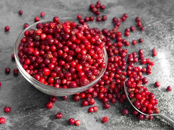 Эта маленькая ягода, вкус которой также знаком многим с детства, вмещает в себя целый кладезь витаминов группы В и С, а также лимонную, щавелевую, яблочную и пектиновую кислоты. Этот суперфуд улучшает работу ЖКТ, а также стимулирует выработку желудочного сока. Благодаря высокому содержанию фенольных антиоксидантов клюква предотвращает появление тромбов, а также укрепляет иммунитет.