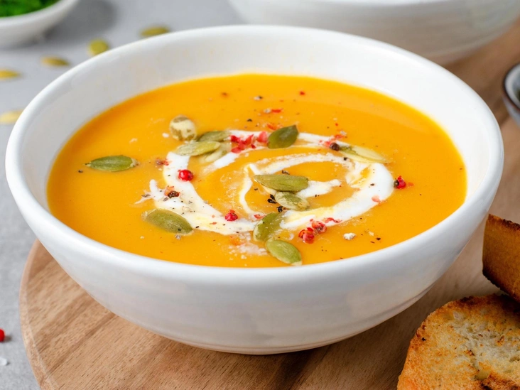 Тыква — это традиционный осенний продукт. И не только из-за Хэллоуина, но и благодаря своему мощному витаминному составу. Она богата витамином С, бета-каротином, калием и витамином Е. Так что выберете любимые овощи, запеките их с тыквой и сделайте ароматный крем-суп.