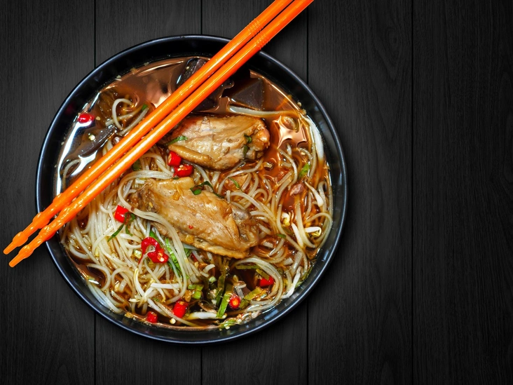 Вскипятите отдельную кастрюлю воды и приготовьте яичную лапшу по инструкции на упаковке, после чего слейте воду и разделите готовую лапшу по тарелкам для супа.