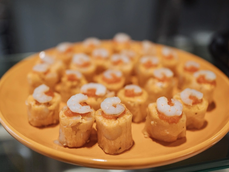 Сделать роллы, используя рисовую бумагу, полить соусом сверху.