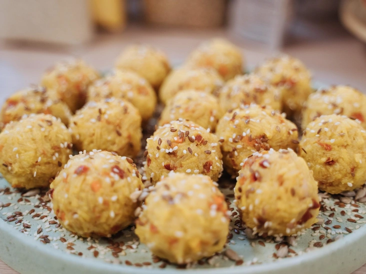 Сформировать из риса с овощами шарики диаметром 3-4 см, внутрь поместить готовое филе голени.