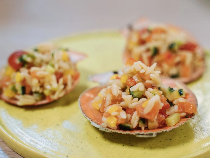 Сварить орзо по рецепту, указанному на упаковке (в кипящую подсоленную воду засыпать пасту орзо (из расчета на 100 г пасты 500 мл воды). Варить на медленном огне под крышкой 13-15 минут, периодически помешивая. Откинуть на дуршлаг и слить воду). Остудить. Одинаково мелко нарезать форель, огурец, перец. Черри нарезать на четвертинки. Смешать все ингредиенты, посолить, заправить маслом, тщательно перемешать. Подавать на половинках створок от гребешков.