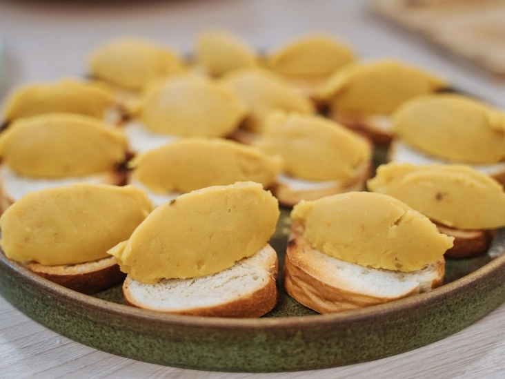 Багет нарезать на кусочки и подсушить (обжарить) на сковороде, не добавляя масло. Выложить дип на кростини.
