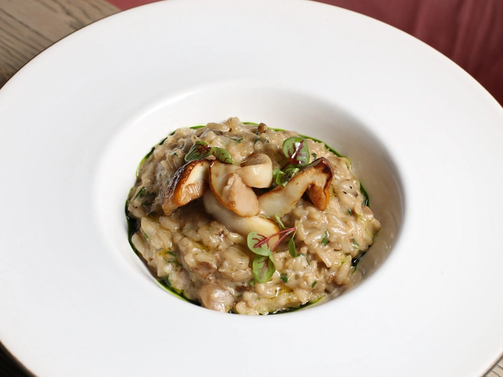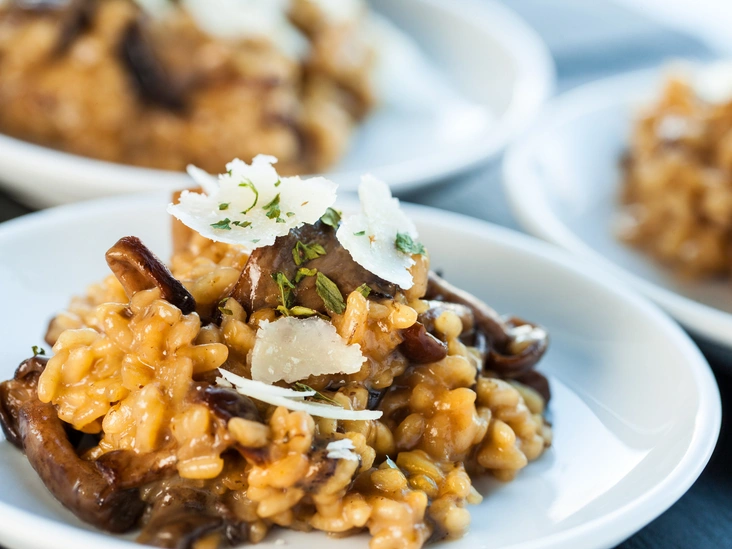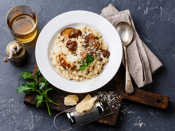 Ризотто: для приготовления ризотто рис (лучше использовать сорта «арборио» или «карнароли») нужно обжарить на оливковом масле до золотистого цвета с чесноком и тимьяном, добавить сухое белое вино и грибной бульон. Готовить 6 -7 минут. Отдельно обжарить белые очищенные грибы (свежие или свежемороженые) с луком шалот. Соединить с подготовленным рисом, добавить морскую соль и черный перец, готовить ризотто еще 7-8 минут до степени готовности риса «al dente», постоянно подливая грибной бульон (читайте также: Как правильно готовить итальянские блюда).