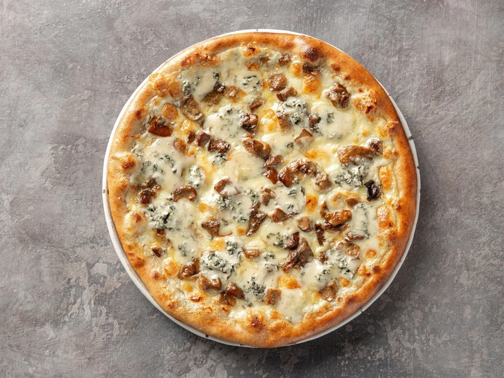Присыпать стол мукой, тесто обвалять в муке и пальцами сформировать борта будущей пиццы. Далее растянуть тесто руками (25 см в диаметре). Сформированную основу для пиццы смазать соусом, посыпать моцареллой. Сверху выложить белые грибы (обжаренные), посыпать сыром дорблю. Отправить пиццу в печь и выпекать 3-5 минут при температуре 350-400 градусов. Готовую пиццу нарезать на 8 частей и посыпать луком сибулет.