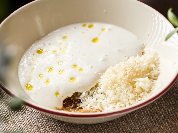Сливки смешать с натертым пармезаном, довести до 80 градусов и держать около этой температуры до растворения сыра. Далее протереть смесь через сито, добавить пасту из трюфеля (10 гр), поместить в сифон и держать при температуре 63 градуса.