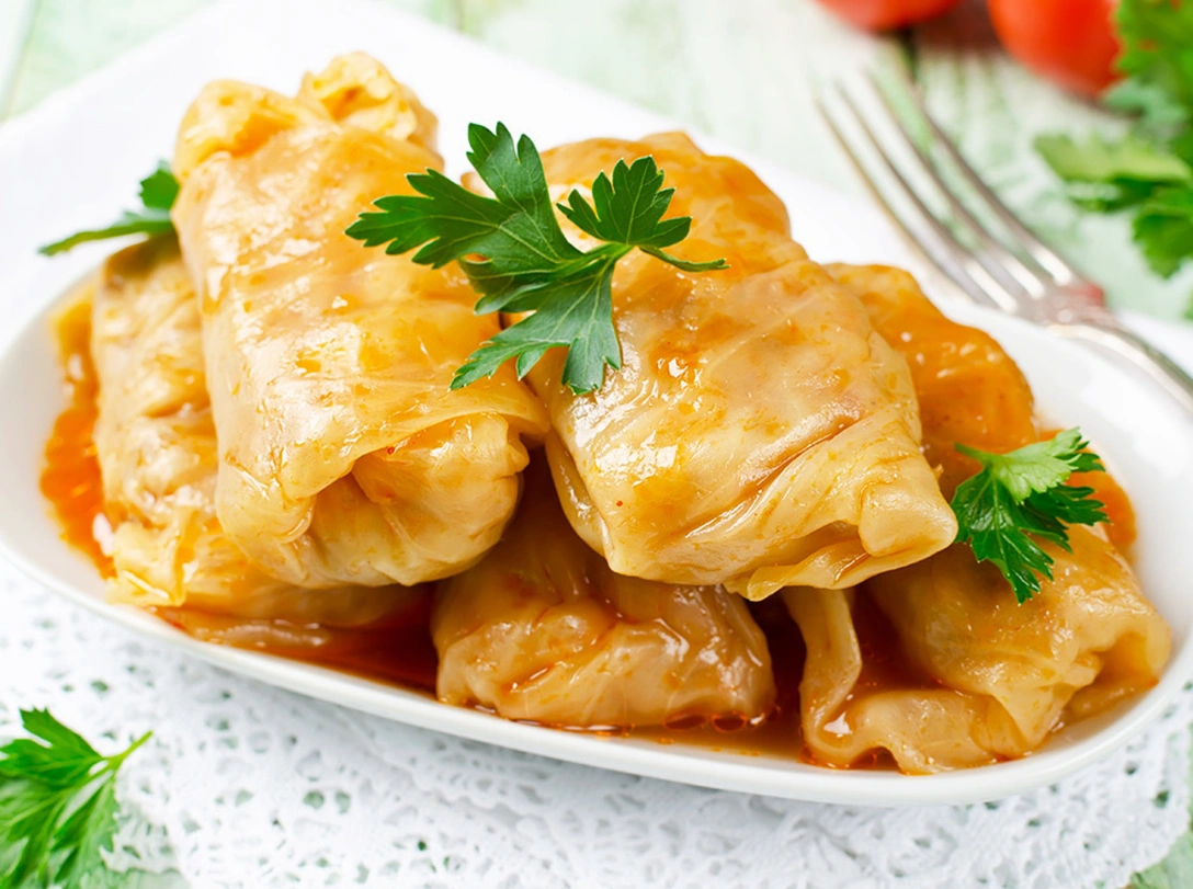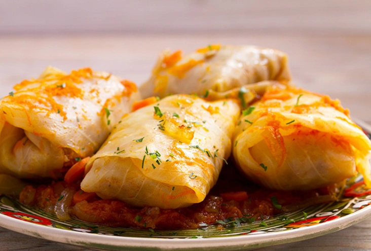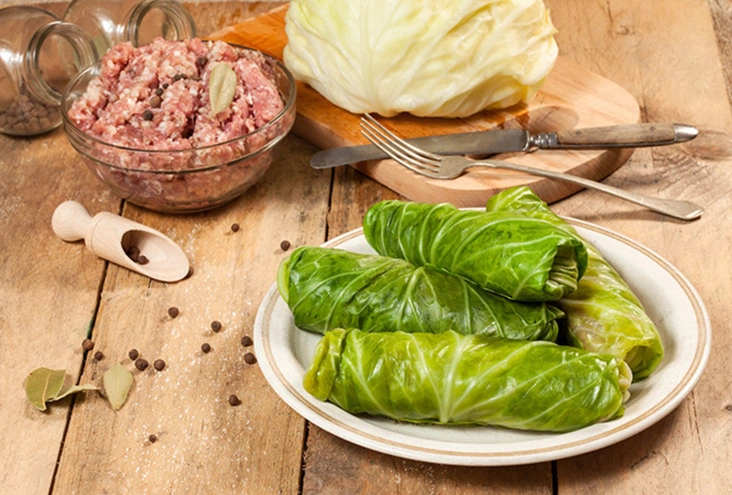 - Делаем фарш, смешав все ингредиенты. Готовый фарш заворачиваем в листья савойской капусты, предварительно отваренные, потом ставим голубцы на пар при температуре 100 градусов на 12 – 14 мин.