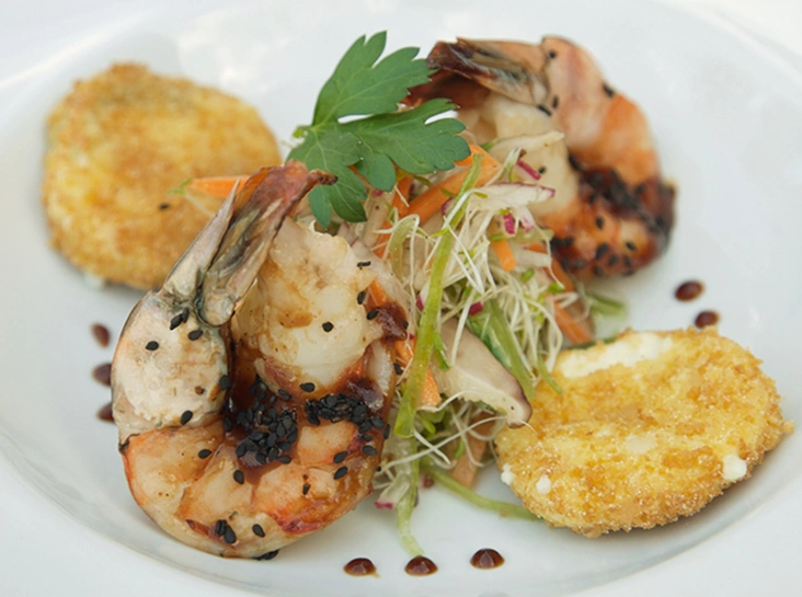 Салат с сельдереем, креветками гриль, белой фасолью и тобико