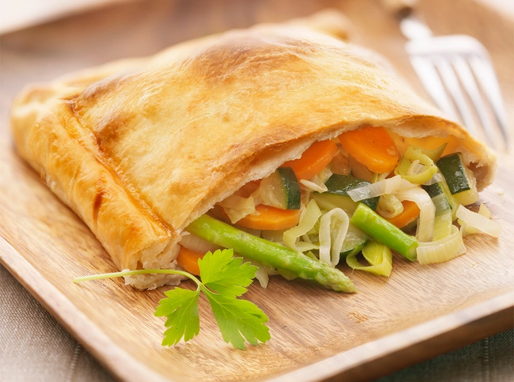 1 пучок измельченной зелени (эстрагон, петрушка, укроп, базилик) • соль • перец • 4 ст. ложки сметаны • 2 пучка молодой спаржи • 4 луковицы • 600 г очищенного от кожи филе лосося (одним куском) • 500 г замороженного слоеного теста (1 1/3 пластины) • 1 яйцо