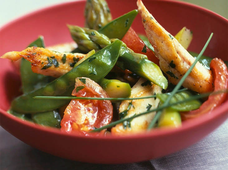 Смешайте две столовых ложки лимонного сока с сахаром, солью, перцем и измельченной долькой чеснока. Замаринуйте в полученной смеси нарезанные кусочками куриные грудки и на некоторое время отставьте их в сторону. Тем временем вскипятите в большой кастрюле воду и по очереди слегка отварите в ней верхушки спаржи, стручковую фасоль, бобы и горошек. Рассчитывайте, что на каждую порцию овощей нужно около 3 минут, а латуку достаточно и нескольких секунд. После этого ополосните овощи холодной водой – это вернет им цвет – и обсушите. Поджарьте бекон на сковороде до хрустящей корочки. Затем выньте, долейте в сковороду оливковое масло и быстро обжарьте в нем замаринованную курицу (по 3 минуты с каждой стороны). Для приготовления соуса соедините майонез со сметаной, солью, перцем и оставшимся лимонным соком и взбейте с помощью вилки. Сервировать блюдо можно, разложив порционно на тарелки – горкой зелень, а поверх нее – цыпленка и бекон. Или же смешав все в салатнице. В обоих случаях главное – не забыть заправить соусом и посыпать пармезаном.