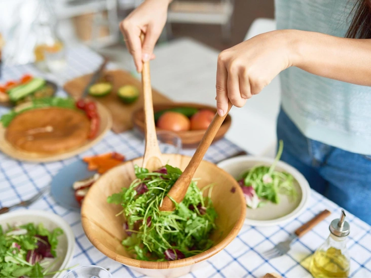 Кроме того, внимательно следите за готовностью ингредиентов в салате. Если в нем есть яйца, они должны быть полностью сварены, если есть курица, то она должна быть приготовлена до внутренней температуры в 74 градуса по Цельсию. Степень готовности можно измерить с помощью специального термометра для мяса.