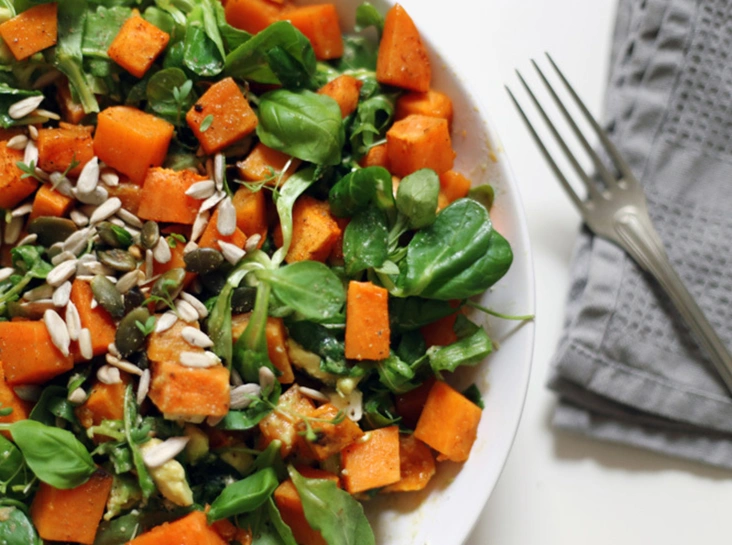 Нарежьте кубиками свеклу и тыкву, морковь нарежьте кружочками. Выложите их на противень, устеленный пергаментом, сбрызните оливковым маслом, посыпьте солью и перцем и отправьте запекаться в предварительно нагретую до 190 градусов духовку на 20-30 минут. В салатницу положите рукколу и корн, туда же отправьте запеченные овощи (немного остывшие), порезанную на кубики фету, раскрошенные грецкие орехи, заправьте все песто.