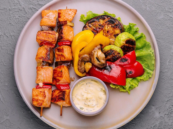 В случае с ограниченным рационом питания на строгой диете не стоит отказываться от такого вкусного блюда, как рыбные шашлыки с салатом из чечевицы и йогуртом (всего 507 калорий на порцию!). Изначально рецепт рассчитан на четырех человек, но вы можете увеличить количество порций по своему желанию. Еще один факт в копилку достоинств этого блюда — готовятся необычные, но не менее вкусные шашлыки всего 22 минуты.
