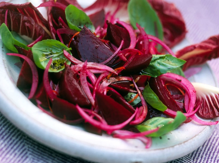 Сварите свеклу, затем остудите, очистите, нарежьте на половинки или четвертинки и выложите в салатницу вместе с луком, стараясь, чтобы луковые кольца не распадались.