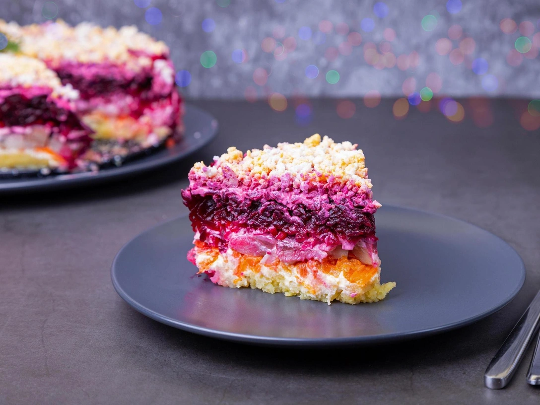 Готовый салат отправляем в холодильник на пар часов, чтобы он пропитался. Перед подачей на стол снимаем форму и наслаждаемся разноцветной феерией. Готово!