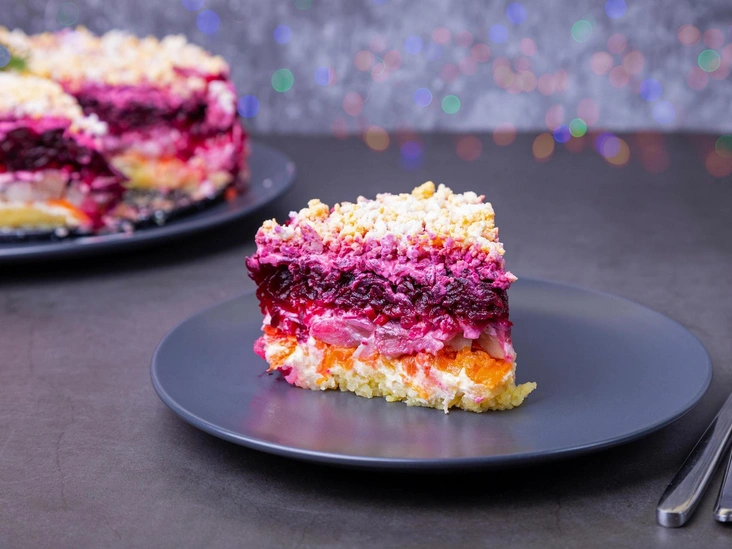 Для третьего слоя смешать натертую на терке отварную свеклу с измельченными грецкими орехами. Слой салата из свеклы снова промазать майонезом.