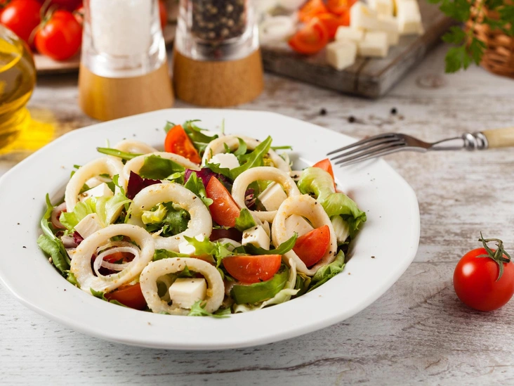 Салат с кальмарами и свежими овощами под экзотической заправкой