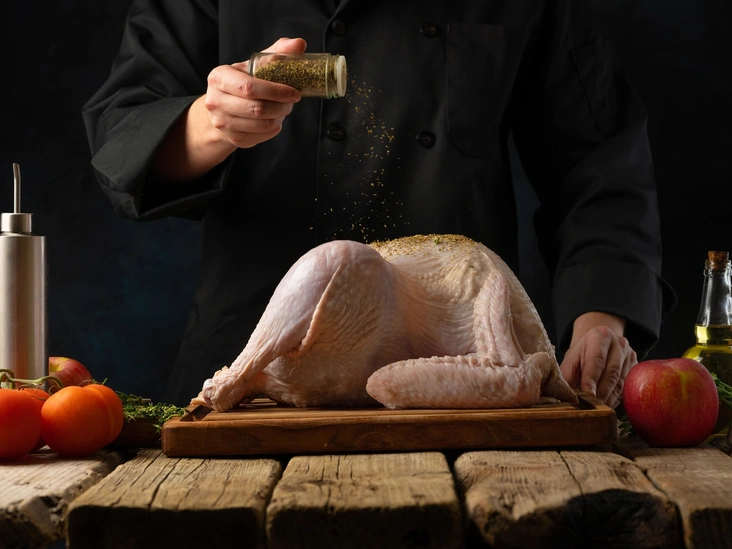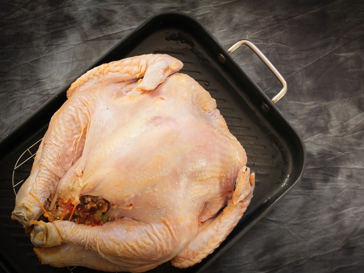 Разогрейте духовку до 220°C. Вы можете взвесить курицу — время приготовления зависит от веса после добавления начинки. Время готовки составляет 20 минут на каждые 500 г плюс 15 минут при высокой температуре в самом начале выпекания.