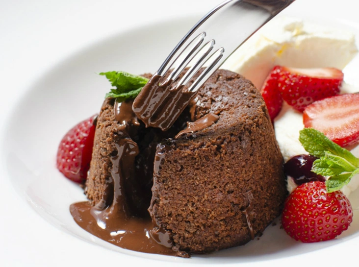 Излюбленный десерт ценителей шоколада. Его особенность заключается в том, что оболочка флана твердая и хрустящая, а сердцевина — жидкая. Шоколадный флан подается с итальянским домашним лимонным мороженым — джелато — для контрастного сочетания вкусов и температур, а также со свежей клубникой и ягодным соусом.