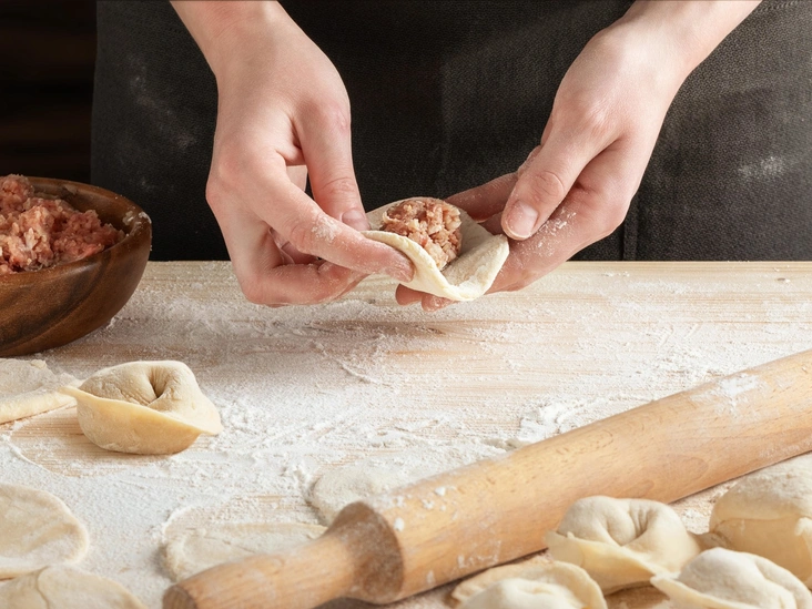 Для теста понадобится мука (600 граммов), одной яйцо, столовая ложка соли и стакан очень холодной воды — благодаря этому будет особо эластичным и податливым. Вымесите тесто, оберните в пленку и оставьте на полтора часа (читайте также: Сэкономите деньги: что добавить в тесто, чтобы выпечка долго не черствела (все это есть у вас на кухне)).