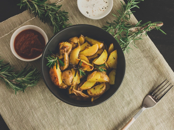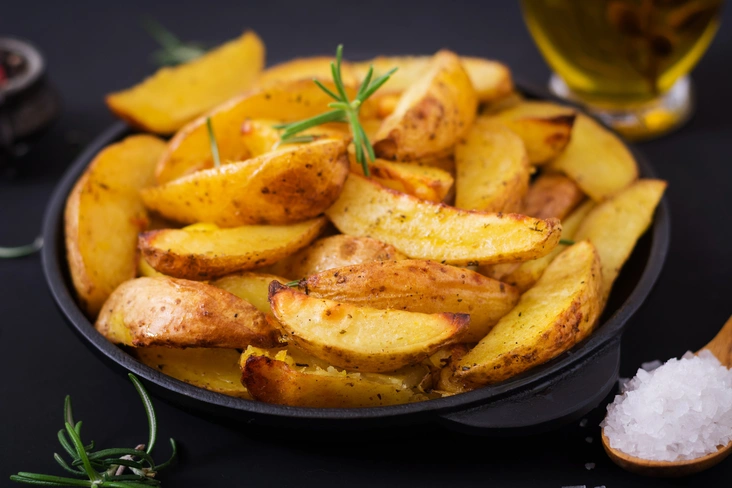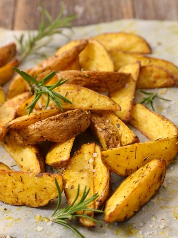 Перед запеканием нужно полить картошку смесью, наполовину состоящей из оливкового масла, наполовину из гусиного жира. Затем надлежит выложить картофель на бумагу для выпечки на противне, чтобы предотвратить прилипание. Противень необходимо отправить в разогретую до 240 градусов духовку, но затем можно убавить огонь, чтобы дать долькам пропечься в центре. Травы, чеснок и другие специи можно добавить в самом конце, чтобы не допустить пригорания, и запекать с ними картофель еще в течение пары минут. Дольки получаются ароматными, с хрустящей корочкой.