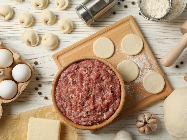 Начинка пельменей может варьироваться — подойдут говядина, баранина, курица, рыба, грибы, а также комбинации из этих продуктов. Все это — удачные вариации классического блюда. Для сочности, как правило, выбирают свиную грудку, менее жирным вариантом считается шея. Также можно добавить сырой лук, если хочется добавить блюду сочности. Чтобы сохранить волокна, не измельчайте мясо слишком сильно.