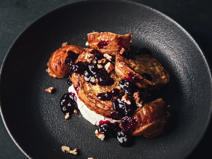 Френч-тост из круассана с черничным конфитюром и кремом на основе сыра маскарпоне и гречишного меда, круассан с лососем и даже с черным трюфелем — вместе с пекарней «Печорин» собрали лучшие рецепты для завтрака, среди которых каждый сможет найти для себя подходящий вариант.