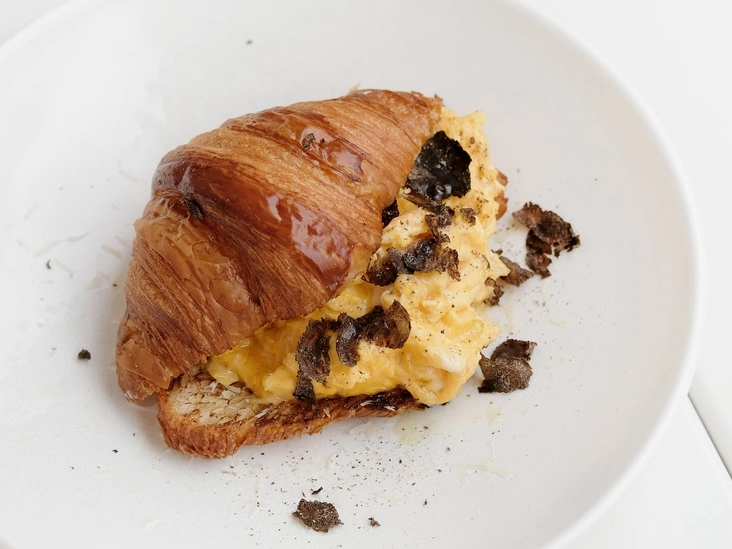 Разрезаем круассан вдоль и обжариваем обе половинки на 10 граммах сливочного масла до золотистого цвета. Перекладываем нижнюю часть в тарелку. Взбиваем венчиком в миске яйца с солью и перцем. Сковороду с тефлоновым покрытием ставим на огонь «выше среднего», кладем оставшееся сливочное масло и выливаем яичную смесь. Активно перемешиваем ее силиконовой лопаткой и доводим до состояния жидкого скрэмбла. Готовый скрэмбл выкладываем на нижнюю часть круассана, обильно посыпаем натертым сыром. Сбрызгиваем оливковым маслом, добавляем черный трюфель (читайте также: На высшем уровне: лучшие рецепты с трюфелем). При желании трюфель можно заменить жареными грибами или беконом, а так же добавить шпинат и томаты черри.
