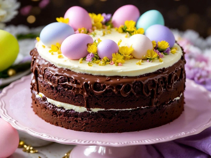 Растопите шоколад. Пока он остывает, взбейте сливки до густого состояния. Смешайте сливки, остывший шоколад и ванильный экстракт. Готовый корж намажьте шоколадным кремом и украсьте шоколадными конфетами в виде яиц.