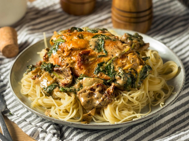 Паста — это одно из блюд, которое может состоять как из простых, так и из изысканных ингредиентов. Сегодня готовим пасту со сливками, шпинатом и курицей, которая готовится без отваривая макарон. Что понадобится из посуды?