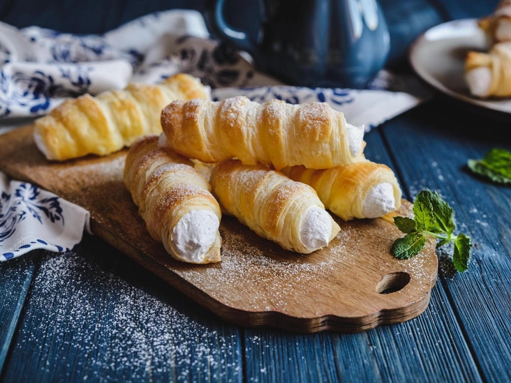 Раскатайте тесто в прямоугольную форму и сделайте 16 горизонтальных надрезов. Возьмите конусообразные формы для трубочек (или сделайте их сами из фольги) и намотайте каждый лоскут теста вокруг формы. Смажьте трубочки желтком и выпекайте 25 минут при 240 градусах.