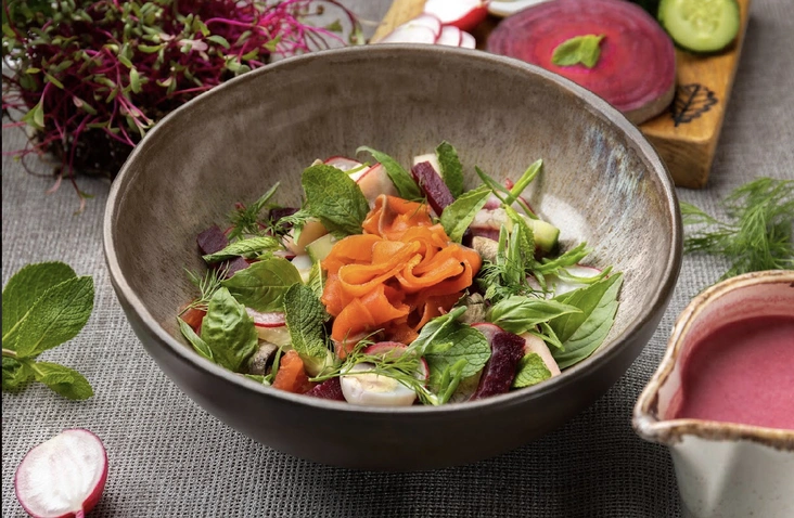 Кажется, в этом году многие шефы задались целью открыть для нас свеклу заново. У Антона Магдюка, бренд-шефа ресторана M2 Organic Club это получается очень органически — вроде бы классический свекольник, но авторским твистом — подкопченной неркой, который можно воплотить и у себя на кухне.