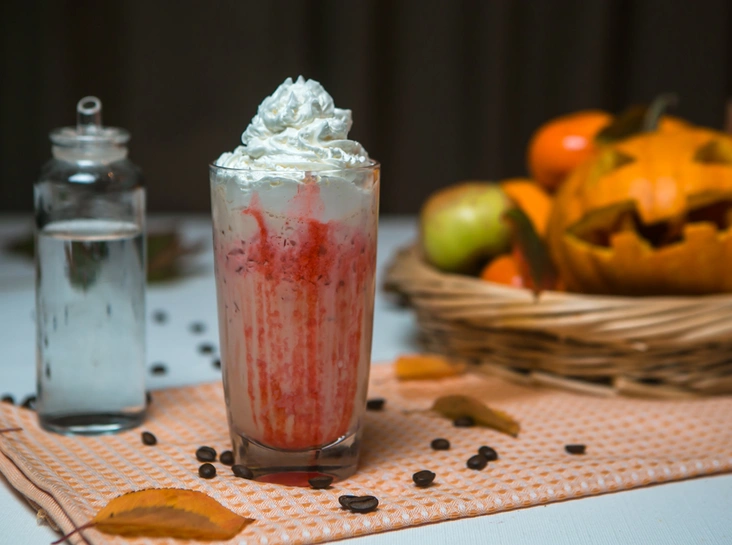 Приготовьте чашку доппио. Молоко, шоколадный сироп и кофе (оставьте третью часть в свободной чашке) смешайте в блендере с колотым льдом до однородной массы и разлей. По внутренним стенкам бокала «кровавыми» каплями нанесите красный сироп (подойдет вишневый или гранатовый). Влейте заваренный доппио в бокалы и украсьте сверху шапкой из взбитых сливок, которые тоже слегка задекорируйте сиропом.