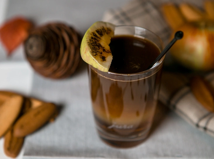 Сварите чашку доппио (двойной эспрессо). Смешайте в одной емкости имбирный сироп, апельсиновый сок и сливки. Разлейте по бокалам и добавьте в каждый равное количество свежезаваренного доппио. Приготовьте «яблоко в карамели»: порежьте свежее яблоко на тонкие дольки, каждую посыпайте сахаром и держите на открытом огне до образования карамели. Украсьте бокалы карамельно-яблочными дольками.