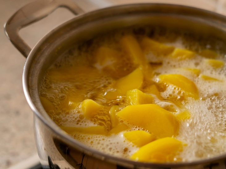 Хорошенько промойте картофель, почистите его от шкурки, нарежьте крупными кубиками и отварите до готовности в подселенной воде. Кубики сварятся быстрее, чем цельные клубни. На это у вас уйдет около 15 минут.