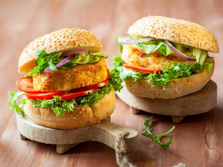 Достаньте рыбное филе из духовки, разрежьте и выложите ломтики на половинки булочек поверх зелени. Сверху посыпьте копченой паприкой и полейте соусом (если используете его).