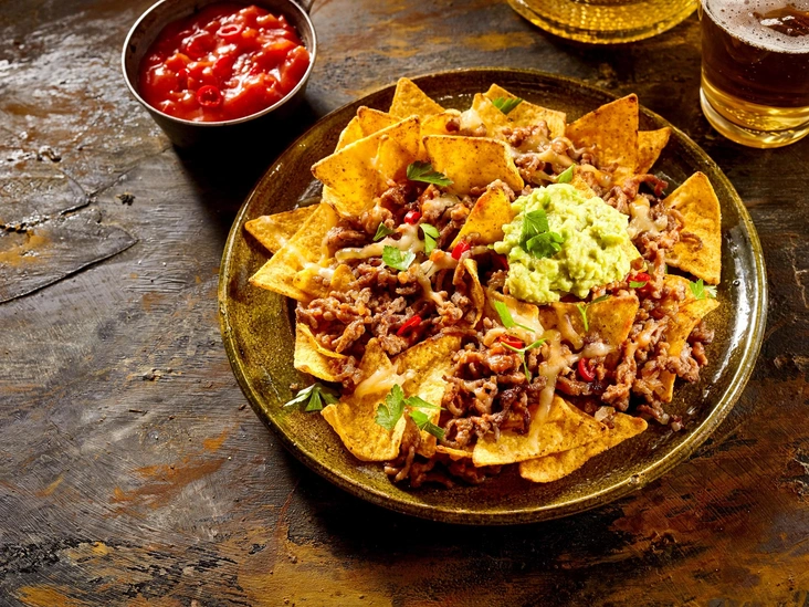 Смешайте помидоры, фасоль и кинзу, приправьте солью и перцем. Равномерно выложите смесь на кукурузные чипсы.