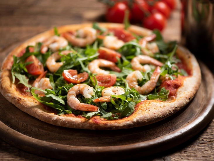 Посыпьте противень полентой. Выложите на него основу для пиццы и смажьте соусом песто. Сверху положите креветки и посыпьте пармезаном.