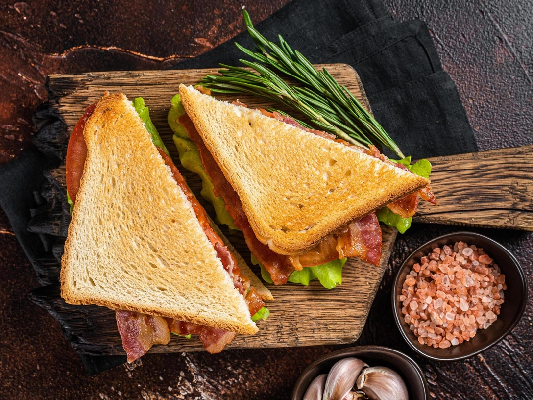 Сэндвичи пришли к нам из Америки — центра быстрой и сытной пищи. Американцы любят сэндвичи с беконом, индейкой, арахисовой пастой и вареньем, ореховой пастой и бананом (и еще многими вкусными начинками). Но это блюдо как конструктор — вы можете сами выбрать любимые ингредиенты. В нашем рецепте тостовый хлеб, бекон, ветчина и овощи. Вот некоторые варианты замены: