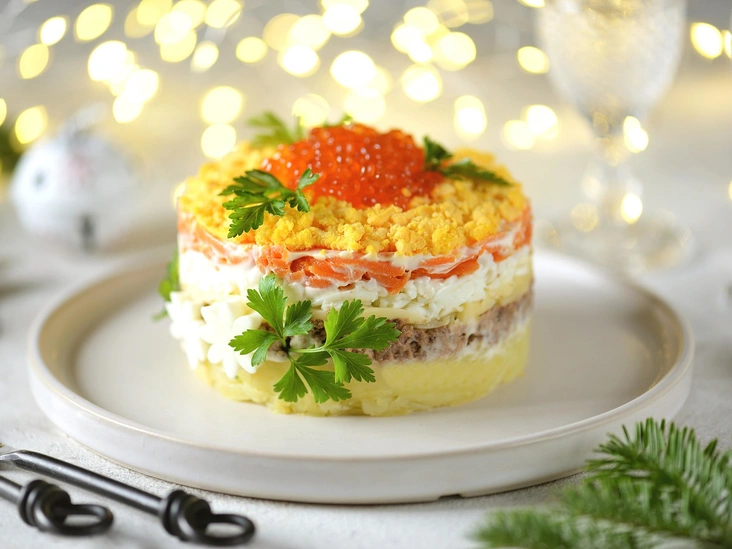 Салат «Мимоза» тоже можно найти на столах в новогоднюю ночь, и это блюдо тоже родом из СССР. В нем нет ничего плохого, но многим оно уже порядком надоело, а после салата с майонезом, будем честны, всегда чувствуется тяжесть в желудке. Лучше приготовить обычный овощной салат или заменить покупной майонез домашним. Приготовьте, например, обновленную мимозу с семгой и красной икрой.
