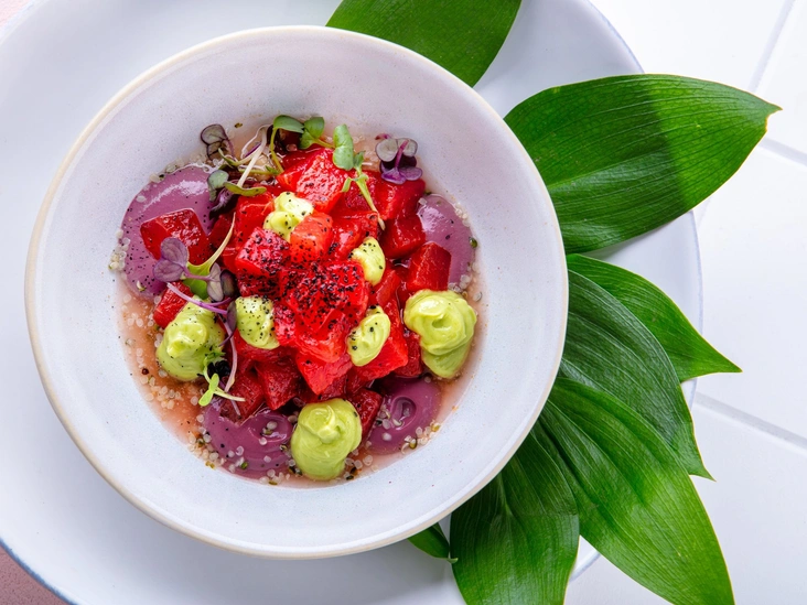 Fake tuna тартар из арбуза с томатно-дубовым кремом
