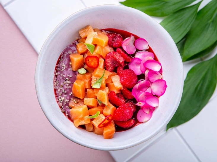 Для тартара из лосося необходимо выбирать свежую рыбу лучшего качества. Для этого подойдет плотное филе ближе к спинной части. Есть классические рецепты тартара из рыбы, но мы решили добавить в рыбу немного яркости в стиле балийских будда-боулов и кисло-сладкое послевкусие со свежими ягодами и сочным соусом. Потому что это невероятно интересное сочетание с неклассическими ингредиентами, которые вкус рыбы раскрывают совсем с иной стороны.