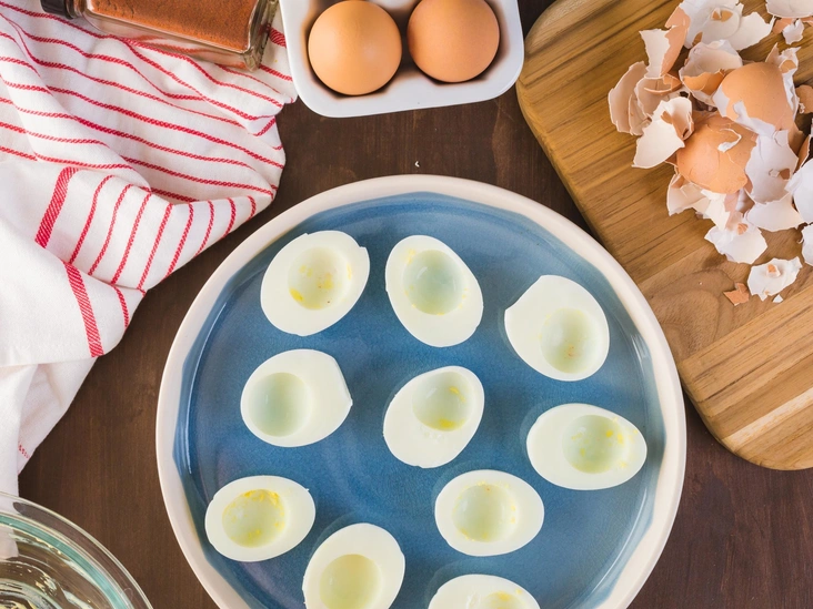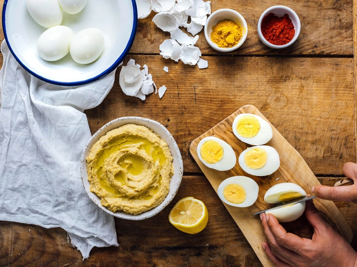 Когда яйца будут готовы, переложите их в миску, залейте холодной водой и оставьте в стороне до полного остывания. После аккуратно очистите яйца от скорлупы и разрежьте их пополам. Отделите желтки от белков и выложите их чайной ложкой в большую миску.
