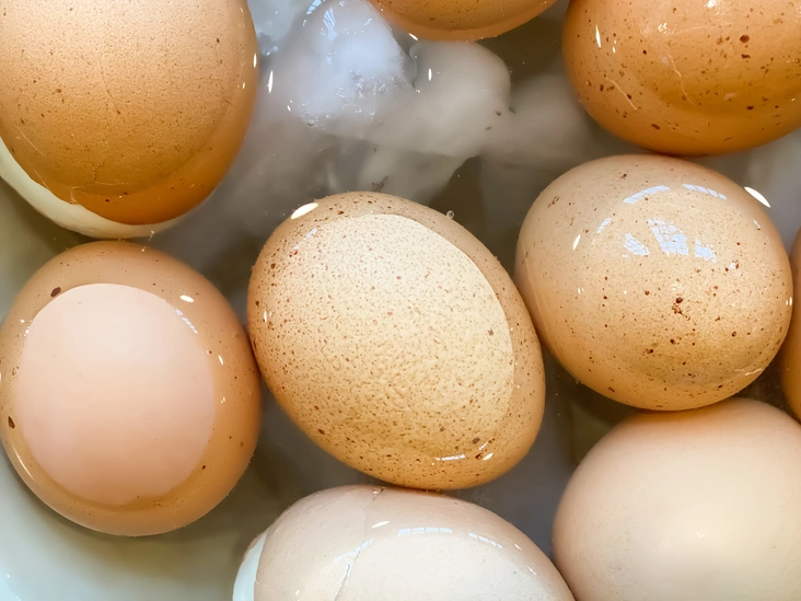Выберите широкую кастрюлю, в которую поместится много яиц. Выложите в нее шесть яиц и залейте их большим количеством холодной воды. Доведите ее до кипения, затем убавьте огонь и варите яйца в течение девяти минут.