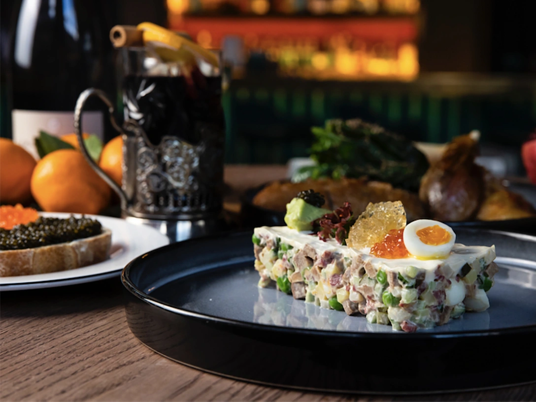 классическое оливье с языком и пастрами. Майонез внутри будет облегченным (из йогурта), а два вида икры и крем из авокадо добавят «модности» любимому русскому новогоднему салату (580 р.);