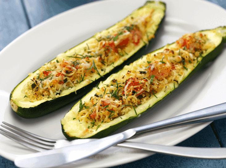 Перемешайте начинку, посолите, поперчите и нафаршируйте ею цукини.